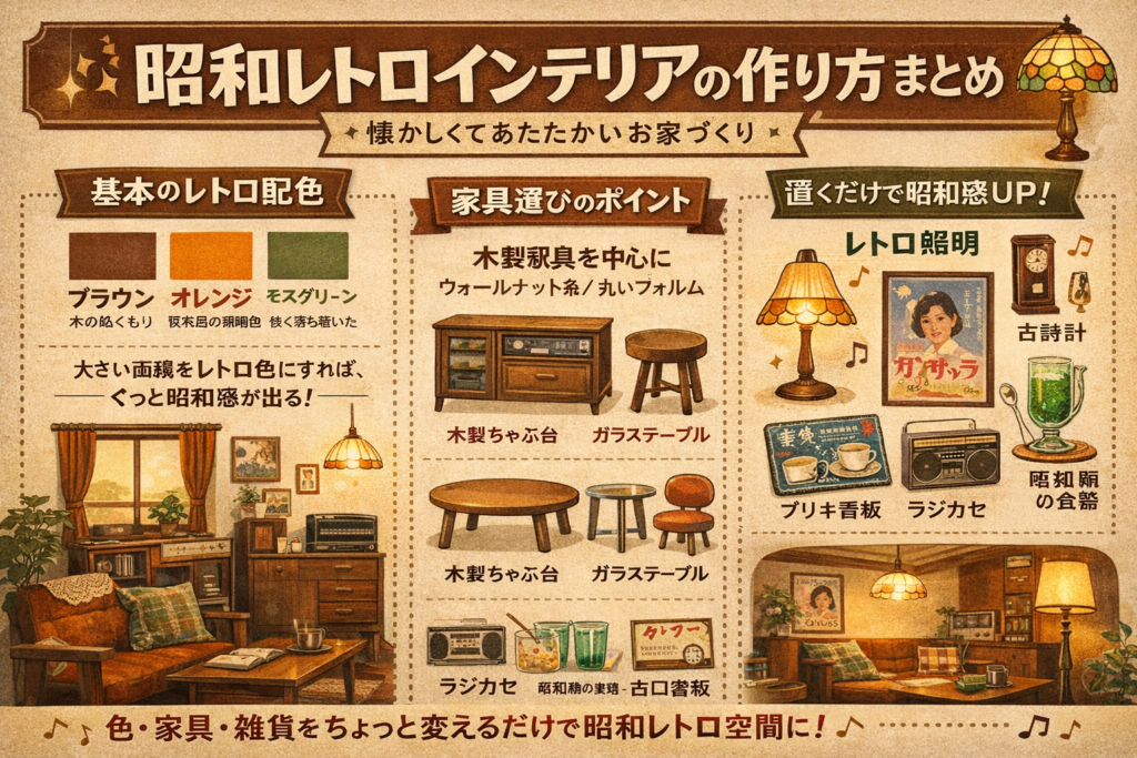 昭和レトロインテリアの作り方を、順を追って解説します。