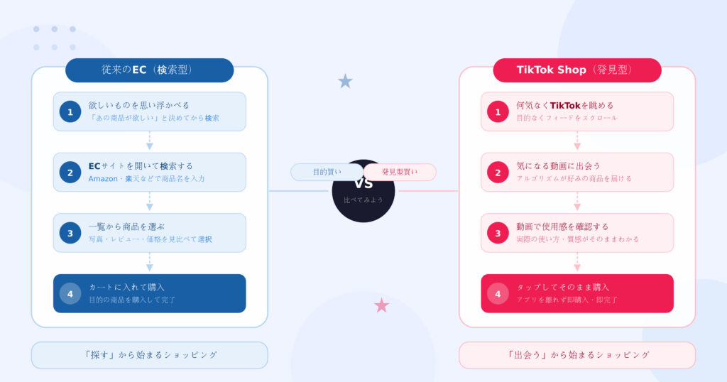 この「見つけた瞬間に買える」体験は「ディスカバリーEコマース(発見型EC)」とも呼ばれ、Amazonや楽天のような「目的のものを検索して買う」従来型ECとは一線を画す、全く新しい購買スタイルです。