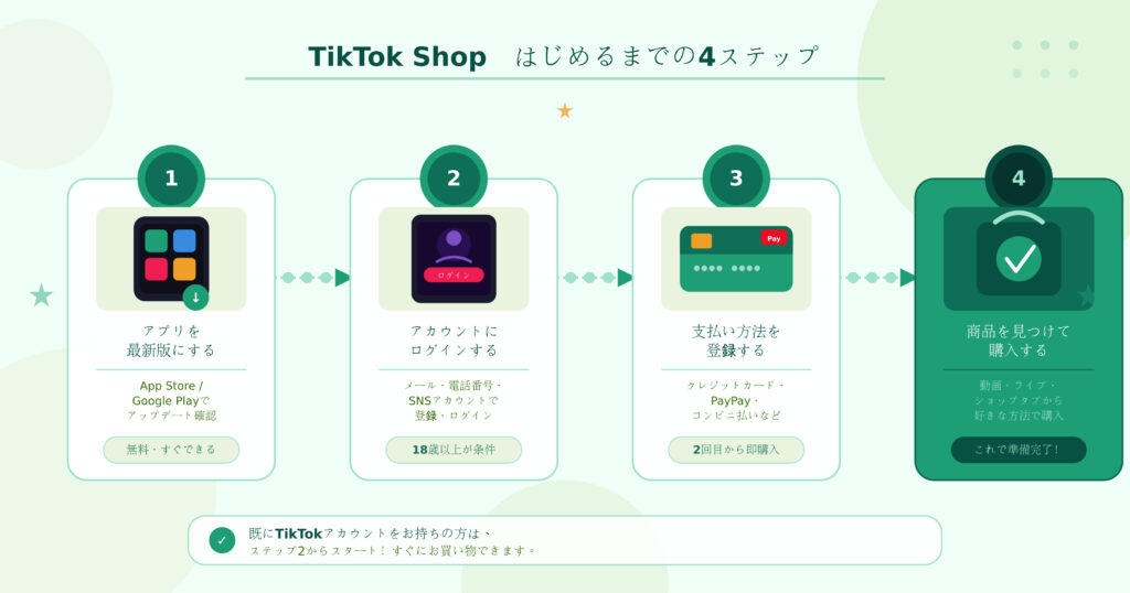 TikTok Shopを利用するのに、特別な手続きや新しいアプリのインストールは不要です。すでにTikTokアカウントを持っている方なら、今すぐ始められます。