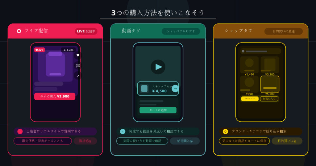 TikTokで買い物する方法は主に3つあります。それぞれの特徴を把握しておくと、自分のスタイルに合った買い物がしやすくなります。