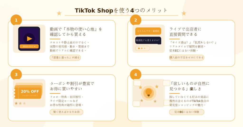 TikTok Shopが多くのユーザーに支持されている理由には、従来のECにはない独自の魅力があります。