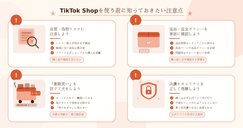 便利で楽しいTikTok Shopですが、安心して利用するためにいくつかの注意点も押さえておきましょう。
