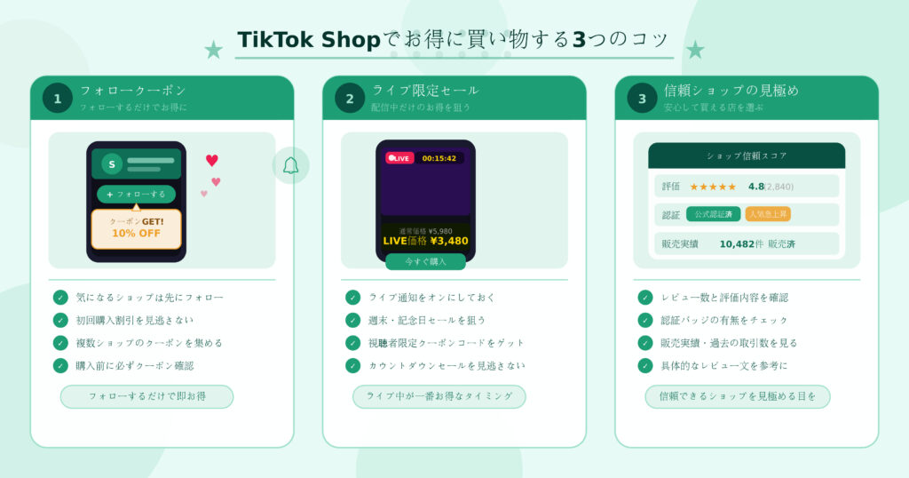 せっかくTikTok Shopを使うなら、よりお得に賢く買い物しましょう。知っているだけで得をする、実践的なコツを紹介します。