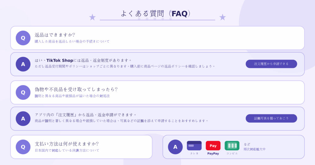 TikTok Shopには返品・返金の制度がありますが、返品期間や条件はショップによって異なります。購入前に必ず商品ページやショップの返品ポリシーを確認する習慣をつけましょう。万が一トラブルになった場合は、TikTok Shop内のサポート窓口を通じて対応を申請できます。
